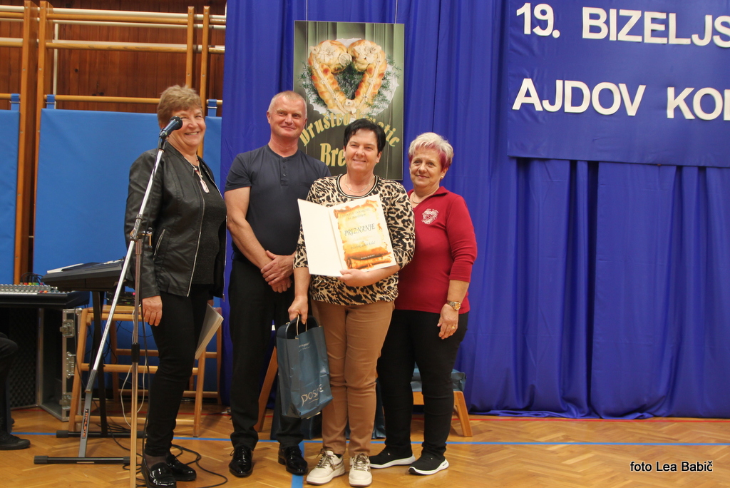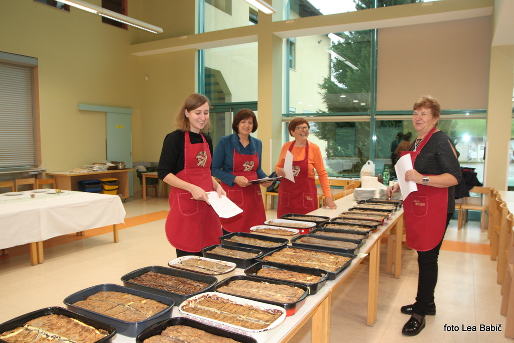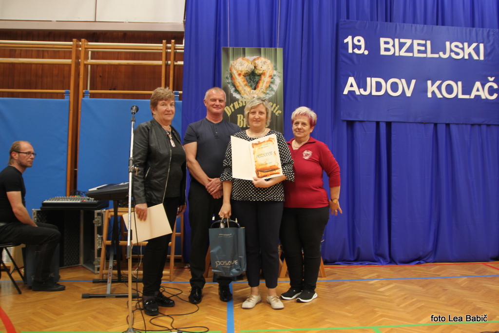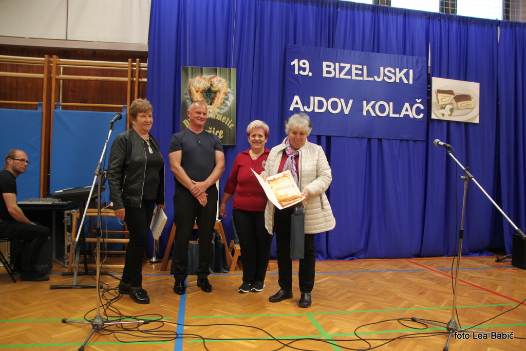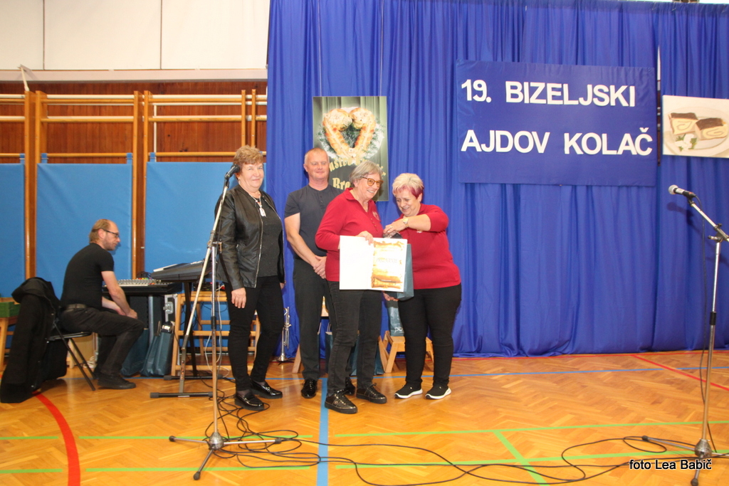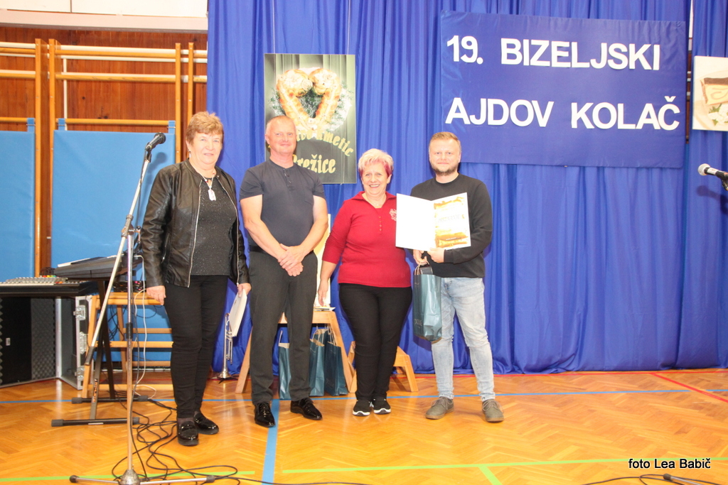 Bizeljski ajdov kolač je slani desert, jed, ki se ohranja skozi generacije. Letos se je v peki pomerilo štiriindvajset pekaric in pekov. V jedilnici Osnovne šole je ocenjevalna komisija v sestavi Slavka Preskar članica DK Brežice, tudi dolgoletna predsednica društva, Terezija Lavrič svetovalka KGZ Novo mesto ter Ema Jevšnik s Kozjanskega parka, ocenjevala kolače, ki so iz leta v leto kvalitetnejši. To je razvidno tudi iz rezultatov, saj je točke za zlato priznanje doseglo kar dvanajst kolačev, osem je bilo srebrnih in le štirje bronasti. Poleg odličnih rezultatov smo ponosne na vpis kolača v Register nesnovne kulturne dediščine RS. Nadvse nas veseli, da se peke lotevajo mladi fantje in dekleta pod mentorstvom babic.