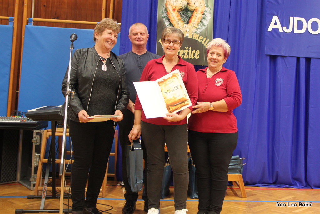 Priznanja so bila podeljena na zaključni prireditvi v telovadnici, kjer je potekal tudi kulturni program. Pripravili so ga učenke in učenci ter vrtičkarji s svojimi mentoricami. Prisotnim so pohvale in vzpodbude izrekli podžupan občine Brežice Miha Petančič, predsednica sveta KS Bizeljsko Mateja Kmetič, predstavnica ZPTM Brežice Špela Turel, predsednica OTZ Branka Stergar in ravnatelj OŠ Bizeljsko Aljaž Božič, ki nam je prijazno odstopil prostore, da prireditev lahko izvedemo. Spregovorila je tudi podžupanja Mojca Florjanič, ki se je izkazala s peko kolača. Koordinatorica projekta bizeljski ajdov kolač Milena Vranetič je predstavila potek ocenjevanja in s podžupanom Petančičem ter predsednico domačega aktiva Slavico Antolovič podelila priznanja. S humorističnim nastopom sta nas nasmejali članici društva Erna in Vesna, ki sta dosedanjima likoma Pepce in Francke dodali še lik fine gospe Marije. Svoj del programa je dodal Bizeljski kvintet, ki je v uvodu izvedel pesem posvečeno bizeljskemu ajdovemu kolaču avtorja Slavka Mihelina ter program zaključili s skladbami, ki vedno navdušijo.