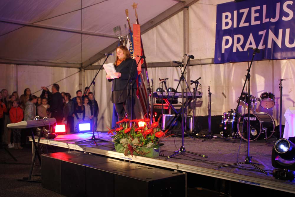 Na prireditvi v počastitev praznika je predsednica sveta KS Mateja Kmetič najprej pozdravila vse prisotne: župana Ivana Molana, ravnateljico Metko Kržan, predsednico združenja za vrednote NOB Bizeljsko Marjetko Gerjevič Slatner, župnika Vlada Leskovarja, svetnice in svetnike KS Bizeljsko, občinsko svetnico, predstavnike sosednjih krajevnih skupnosti, predstavnike društev in ostalih organizacij, ostale goste in nastopajoče ter vse krajanke in krajane ter predstavila opravljeno delo v minulem letu in načrte za prihodnje z besedami: » Letošnje leto je bilo močno zaznamovano z neprijetnimi dogodki tako pri nas kakor tudi v svetu. Močna neurja s točo so klestila žal tudi po naših krajih in uničevala kmetijske pridelke in tudi infrastrukturo ter avgustovske poplave, ki so prizadele tudi del naše Občine.