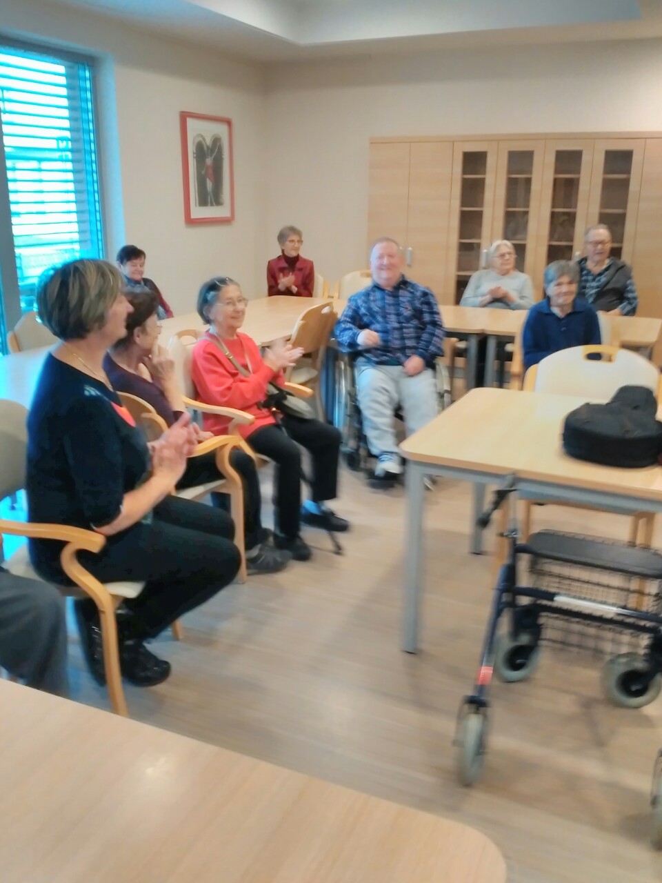 V klubskem prostoru doma smo se družile in poveselile z njimi. Gospod Jagodič Anton jim je zaigral na harmoniko, kitaro in na orglice. Skupaj smo peli, se veselili ter poklepetali ob kavici. Prinesle smo jim darila, zaželele lepe božične praznike v novem letu pa predvsem zdravja. Našega obiska so bili izjemno veseli, še posebej pa g.Jagodiča in njegovih ubranih pesmi iz njihove mladosti.
