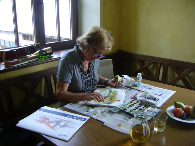 Popoldneve najraje preživi v senci naše stare lipe in slika. Prva slika, nastala na Bizeljskem, je bila slika starega sosedovega senika, delana v tehniki tuša, katero nam je gospa Mara tudi podarila. Sledile so še slika device Marije z Jezusom v naročju, pejsaž sv. Vida in Penzion Merkež. Z možem se odpravita tudi na potep po okolici Bizeljskega in bližnjem Obsotelju.