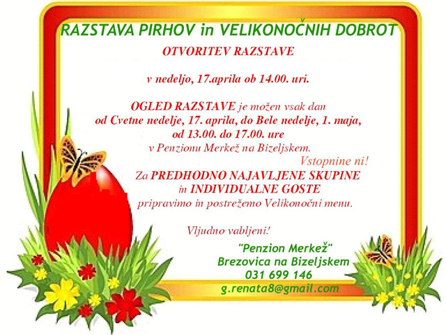 Otvoritev razstave je v nedeljo, 17. aprila ob 14.00 uri. Ogled razstave je možen vsak dan od cvetne nedelje, 17. aprila, do bele nedelje, 1. maja, od 13.00 do 17.00 ure v Pensionu Merkež na Bizeljskem.
