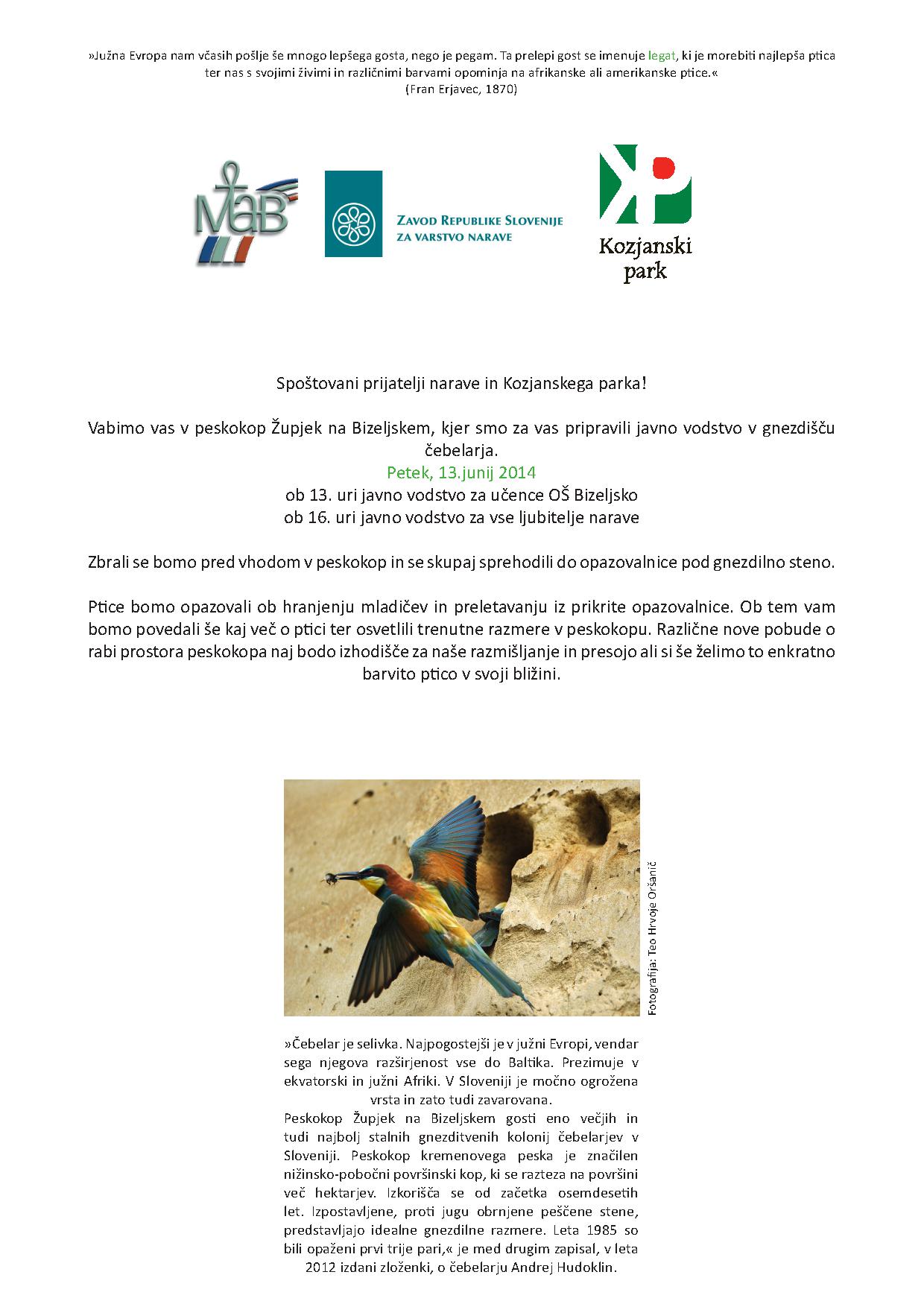 Javni zavod Kozjanski park vabi v petek, 13. junija 2014 ob 16.00 uri v peskokop Župjek na javno vodstvo v gnezdišču čebelarja. Vsi vljudno vabljeni!