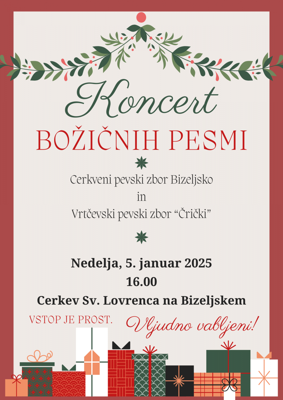 Cerkveni pevski zbor Bizeljsko in Vrtčevski pevski zbor “Črički” vabita na koncert Božičnih pesmi, ki bo v Nedeljo 5.1.2025 ob 16:00 v Farni cerkvi Sv. Lovrenca Bizeljsko.