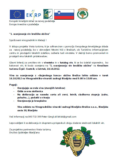 Glavni kriterij za uvrstitev vin v vinoteko in v katalog vin, ki se bo izdelal vzporedno, bo kakovost vin, ki bodo ocenjena na “1. ocenjevanju vin brežiške občine” na Kmečkem turizmu Črpič- Svetnik, v četrtek, 18. 10. 2012.
