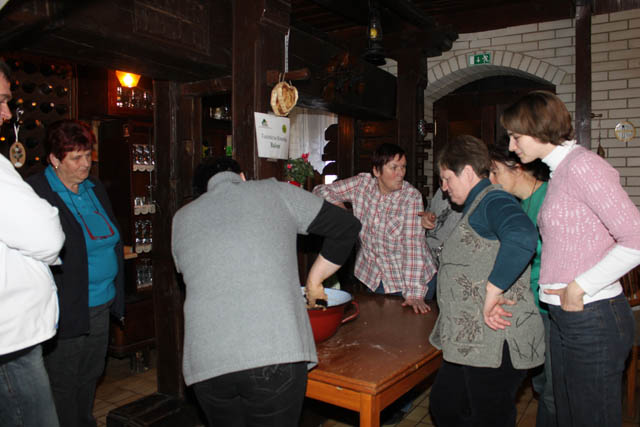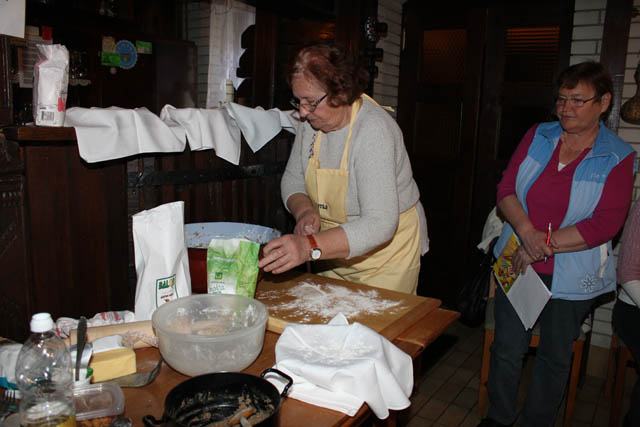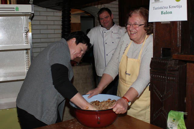 Članice društva kmetic smo se udeležile tečaja priprave jedi iz ajde. Na turistični kmetiji Balon – Bela gorca nam je kuhar Damjan Golob prikazal pripravo ajdove ocvirkovke, palačink, pogače, njokov in hlebčkov z jetrnim nadevom. Med delom rad odgovarja na vprašanja in pove marsikateri koristen nasvet.